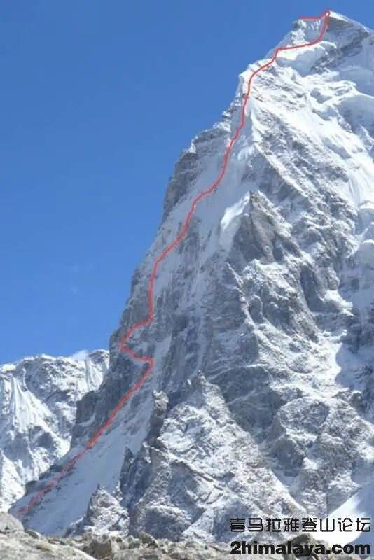 我们在大本营之上进行了五日攀登。旅行初期的狂风和降雪阻止我们取得进展,在完成登顶一日后返回。道路下端分布着山檐和陡峭的雪层附着檐沟,连接状况出色的雪层/冰面附着山脊。山脊尖利,山峰任何一侧山壁都相当陡峭。顶峰部分有数条岩石带,我们沿有流水穿过的烟囱状地点穿行。美丽的烟囱状区域顶端颇为恐怖,我们几乎径直站在顶峰。从位于尼泊尔/中国西藏自治区边境的顶端,我们眺望到如此之多引人瞩目的山峰,而且一直可以看到印度境内的景象。