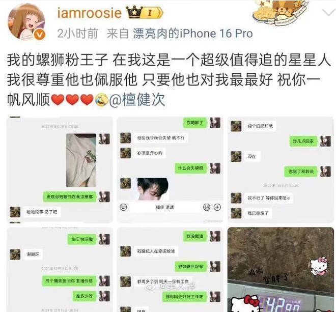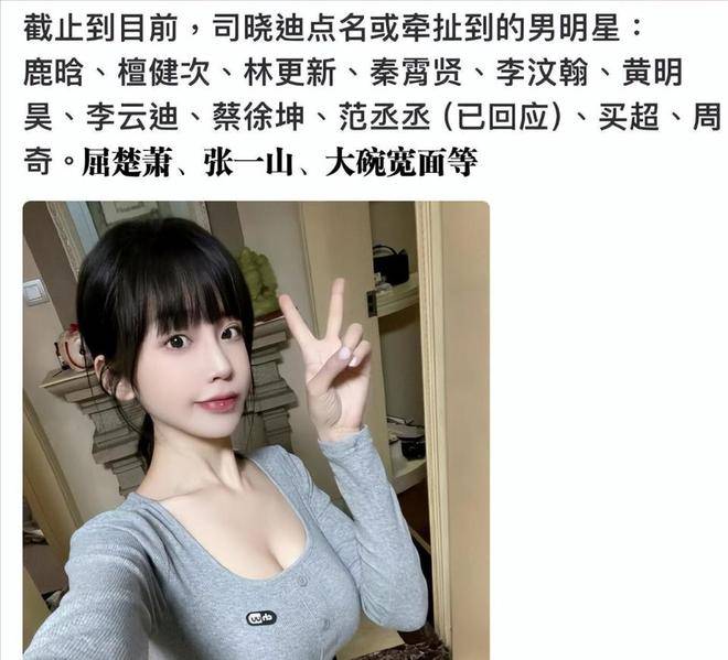 1月2日深夜,司晓迪在社交媒体上展开了一波疯狂的操作。她首先在粉丝群中放出线就爆顶流瓜。随后,她在微博、抖音、小红书等平台同步发布了十条动态,每条都宣称自己掌握了实锤。针对鹿晗,她晒出了一张模糊的同床照,并称自己见过鹿晗的纹身,还附上了醉酒视频截图和暖脚的照片,暗示两人从2017年到2023年保持着亲密关系。对范丞丞,她放出了两人的K歌和滑雪合照,制造了一种姐弟恋的氛围;而对于林更新,她晒出了密室逃脱时的同款饰品和聊天记录,指控林更新是通过女性朋友认识她,却偷偷和这位朋友交往。最离谱的是,司晓迪竟然提到吴亦凡,称吴亦凡在狱中给她送新年祝福,还详细描述了所谓的喂水、擦PP、舌吻等荒谬的细节。这一说法显然违反了司法常识,迅速成为网友的调侃对象。她甚至将一些无关的艺人也牵扯进来,在500人的粉丝群中爆料称王安宇和关晓彤正在恋爱,使得这场风波的影响范围进一步扩大。